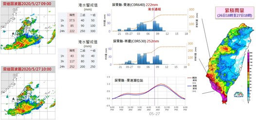 自2020年5月27日凌晨起,臺灣受到滯留鋒面及西南氣流的影響,造成南部地區降下豪雨,午後雨勢便逐漸趨緩。根據5月26日18時至5月27日12時的累積降雨,0527豪雨事件主要在高雄、屏東沿海地區降下豪雨(200mm/24h)甚至豪大雨(100mm/3h)等級的降雨,觀測資料顯示屏東縣東港鎮東港測站(C0R740)的最大1小時累積雨量為37.5毫米,3小時累積雨量達85毫米, 24小時累積雨量達222毫米,已接近淹水二級警戒標準。屏東縣林邊鄉林邊測站(C0R530)最大1小時累積雨量為43毫米,3小時累積雨量達117毫米, 24小時累積雨量達252毫米,已超過淹水一級警戒標準。