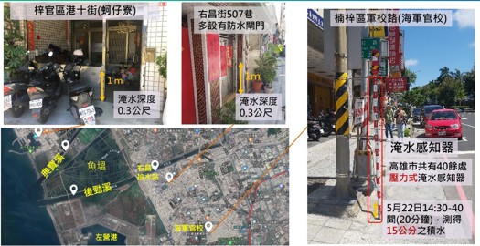 此次調查之高雄市共有40餘處裝設淹水感知器,主要以連續性壓力式為主。0522豪雨於5月22日14:30-40間(20分鐘),楠梓區軍校路未來海岸社區(海軍官校門口對面)測得15公分積水深度,為0522豪雨於高雄市之淹水感知器測得最大水深。