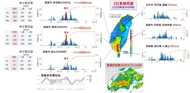 自2020年5月22日起,臺灣受到鋒面與西南氣流持續增強的影響,導致南部多處地區降雨顯著,直至23日上午因鋒面南移,雨勢才逐漸趨緩。根據5月21日0時至5月24日0時的累積降雨,0522豪雨事件主要在高雄、屏東等地降下豪雨(200mm/24h)甚至豪大雨(100mm/3h)等級的降雨,觀測資料顯示最大時雨量位於屏東縣春日鄉大漢山測站(C0R440)的65.5毫米,3小時累積雨量174毫米,日累積雨量723.5毫米,總累積雨量達955毫米;而高雄市的降雨僅次於屏東縣,豪大雨造成市區多處淹水災情傳出,從高雄地區的雨量序列資料可看出,主要降雨峰值發生於5月22日7時至9時,期間適逢海水漲潮,造成沿海低窪地區排水不易。