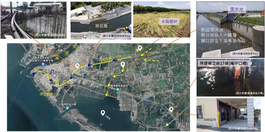 據EMIC、學研機構及媒體報導記錄,高雄市鹽埕區七賢三路一帶在5月22日上午9時起有多處發生積淹水情形,包含:興華街、富野路、瀨南街到大公路等街道都有積淹水情形,水流不斷灌進路邊住戶,災時照片及其位置如圖所示,由照片可知七賢三路部分低窪路面已出現積水,最大積淹水達30公分,且水不斷淹進一旁的騎樓與住家,部分機車和汽車疑浸泡於水中。