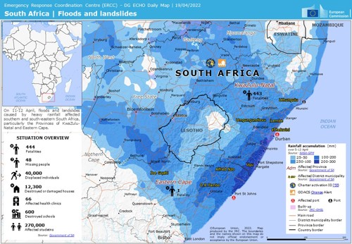 南非東岸自2022年4月9日起降下豪大雨並造成嚴重洪災及崩塌,造成誇祖魯-納塔爾省、東開普省及聖約翰港口(Port St Johns)等地區傳出嚴重的災情。據官方估計共有超過4萬人因災害而流離失所、近4千所房屋全毀,8,300多所房屋部分損毀,以及444人死亡(截至4/18),此事件為南非歷史上第二高死亡人數事件,僅次於1987年9月災害事件。