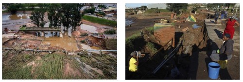 圖3.跨祖魯-納塔爾省德班災害圖(左圖為德班一處高速公路橋梁斷裂,右圖為民眾於破裂水管中取水使用)