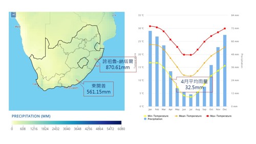 圖1.南非1991-2020年統計年平均雨量及月平均雨量(資料來源:https://climateknowledgeportal.worldbank.org/country/south-africa/climate-data-historical)