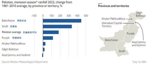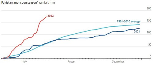 每年,巴基斯坦都依靠來自印度洋的季風為其作物帶來降雨,並為其湖泊和水庫補水。但近年來,季風越來越強,造成的破壞也越來越大。今年5月起,巴基斯坦北部地區便受到熱浪的影響,導致喜馬拉雅山的冰川融水,已造成部分地區洪水氾濫,隨後,緊接著南亞季風到來,截至8月底,巴基斯坦的累積降雨量已達30年年平均降雨量的三倍,導致該國有三分之一的地區慘遭洪水淹沒,而在這個有65%的人口皆仰賴農業生產的國家,氾濫的印度河(Indus River)及其眾多支流沖破了河岸,摧毀了建築物及農作物,影響了數百萬人的生計。圖2為2022年6月中旬至7月中的每日降雨曲線與過去統計比較圖,降雨強度遠高於過去平均;圖3為各省份於2022年7月份與1961-2010年間的7月平均降雨量相比,俾路支省的降雨量比過去平均多了446%,信德省則是336%。