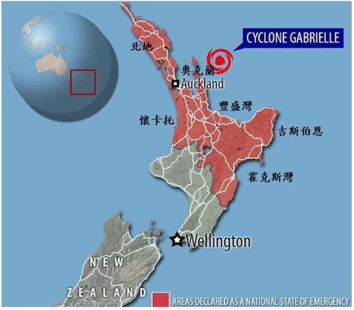 紐西蘭國家應變管理中心(national emergency management agency)在2月11日上午發布公告,要求居民在嘉布瑞爾颶風來臨前做好準備,包含關注天氣預報、準備防災包、清除排水溝碎屑與落葉、捆繫好屋外物品、訪視關心鄰居或需要幫助的人,並提前做好可能停電的準備[7]。紐西蘭消防及緊急應變署(Fire and Emergency New Zealand, FENZ)從2月13日開始收到許多求助電話,消防及緊急應變署與都會搜救署(Urban Search and Rescue, USAR)合作展開救援任務。並於2月14日凌晨,消防及緊急應變署發布Motutara、Oaia地區有崩塌風險,建議居民疏散[8];同日,紐西蘭國家應變管理中心發布國家緊急狀態公告,其區域包括霍克斯灣、北地、奧克蘭、懷卡托、吉斯伯恩、豐盛灣及塔拉魯阿(Tararua)地區(圖4),藉此快速調動全國資源投入救災工作,提醒當地居民相關注意事項,提供緊急避難所地點和援助金申請資訊[9]。
