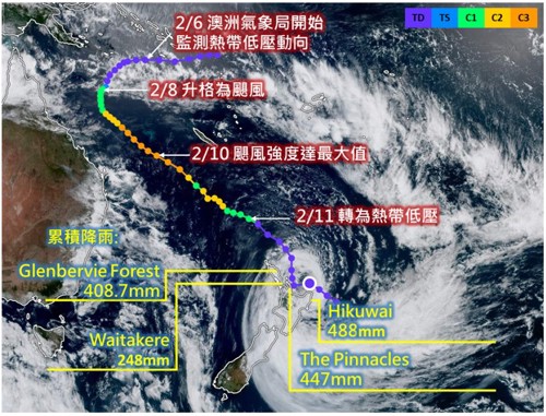 圖1、嘉布瑞爾颶風路徑、強度與觀測累積雨量,強度以薩菲爾-辛普森颶風風力分級,TD為熱帶低壓,TS為熱帶氣旋,C1為第一級,C2為第二級,C3為第三級,累積雨量時間為2023年2月12至15日(底圖來源:Zoom Earth)