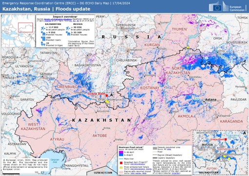 根據歐洲緊急應變協調中心(Emergency Response Coordination Centre, ERCC)之影響評估,俄羅斯疏散了3萬多人,約2.3萬房屋遭到洪水淹沒;哈薩克則疏散了約12萬人,約1萬棟房屋受洪水影響,洪災畫面與洪水災害概要如圖2、圖3 [2、3]。俄羅斯當局估計洪水造成的損失達 400 億盧布。