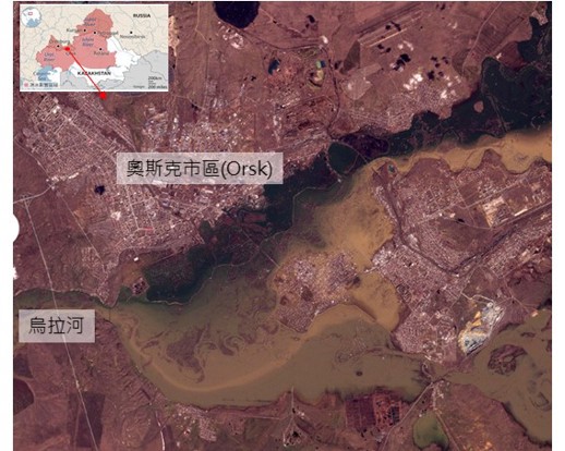 自4月3日以來,俄羅斯與哈薩克北部因氣溫升高,使得冰雪快速融化,加上降雨影響,造成洪水氾濫,其中位於俄羅斯奧倫堡州(Orenburg)受災最嚴重,其中奧斯克(Orsk)的一座水壩潰壩,造成烏拉河(Ural River)下游的洪水災情;此外,托博河(Tobol River)、伊希姆河(Ishim River)也面臨著河川溢堤淹水的挑戰,整體影響區域如圖1所示[1]。