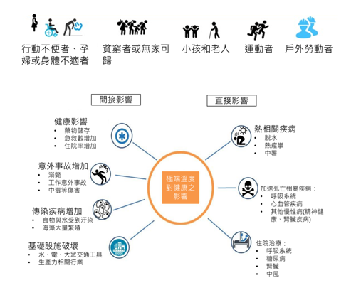 圖4.世界衛生組織彙整熱浪影響族群和造成健康影響(資料來源:WHO)