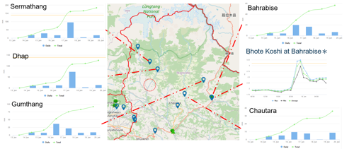 圖3、辛杜帕爾喬克縣內雨量站測得知日雨量資料,*號為日水位資料(資料來源:http://hydrology.gov.np/[3])