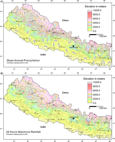 圖1、(A)尼泊爾年平均累積雨量 (B)尼泊爾24hr最大累積雨量(資料來源:Ranjan Kumar Dahal,2008[1])