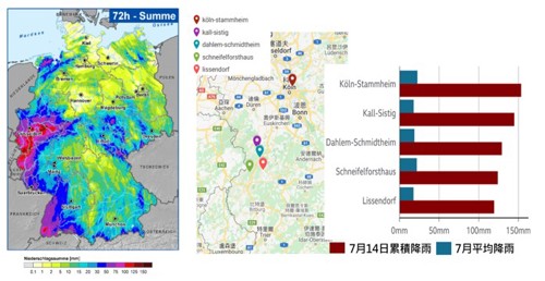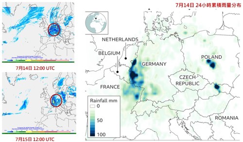 根據歐洲中期天氣預報中心(European Centre for Medium-Range Weather Forecasts, ECMWF)資料顯示,7月14日至15日有一風暴系統在西歐上空滯留,導致德國、比利時、盧森堡、瑞士、法國和荷蘭出現創紀錄的降雨,由圖4 (左)可以看到風暴系統在這兩日持續在西歐地區降雨,而圖4 (右)是7月14日之24小時累積雨量分布,最大累積雨量高達100毫米。德國北萊茵-西發利亞邦南部和萊茵蘭-普法茲邦北部也出現強降雨,24 小時累積降雨量平均為100至150 毫米,遠超越當地七月份平均降雨量。
