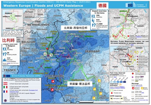 歐洲西部7月14日破紀錄的暴雨,導致多條河流溢淹,為1940年代以來最嚴重的洪災。洪災重創德國西部、比利時、盧森堡、荷蘭、奧地利、瑞士、義大利等國,據報導截至7月23日洪水至少造成228人喪生,其中德國有184 人死亡、比利時有41人死亡,義大利有1人,奧地利有1人,以及羅馬尼亞有1人。圖1是歐盟緊急應變協調中心 (Emergency Response Coordination Centre, ERCC)繪製之洪災影響圖(7月16日版),圖中指出重災區為德國西部、比利時東部與盧森堡,其中默茲河(meuse river)因豪雨造成河水溢堤氾濫,致使當時德國境內有超過1,500人處於失聯或失蹤狀態。