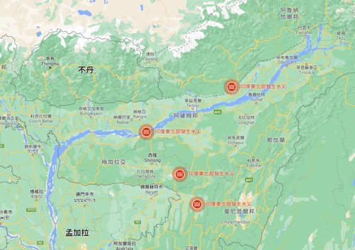 如圖4所示,根據2022 年 5 月 25 日歐盟緊急應變協調中心(Emergency Response Coordination Centre, ERCC)統計資料顯示[4],本次強降雨造成印度之布拉馬普特拉河流域與孟加拉東北部地區嚴重淹水。印度受洪災影響人數約651,180人,以及至少62人死亡;孟加拉受洪災影響人數約2百萬人,以及10人死亡。圖5 (左)為印度阿薩姆邦的 5 月洪災照片[3],以及圖 6 (右)為孟加拉的 5 月洪災照片 [5]。圖 6 為Google提供印度阿薩姆邦及其鄰近地區洪災發生位置。圖 7為歐盟緊急環境管理衛星圖像服務(Copernicus Emergency Management Servic)分析孟加拉西北部於 5 月洪災淹水範圍的結果 [5]。