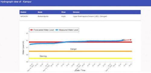 如圖 2 所示,印度阿薩姆邦和孟加拉等地區座落於布拉馬普特拉河(Brahmaputra river)流域,布拉馬普特拉河從中國流入印度阿薩姆邦後,進入孟加拉地區,並與恆河(Ganges river) 匯流後流入孟加拉灣[2]。如圖 3 所示,位於布拉馬普特拉河流域之卡姆普鎮(Kampur)水位站, 5 月 17 日的水位已超過 62 m,已超過歷史水位紀錄61.8 m (2004 年 7 月)。此外,觀測水位亦已經超過危險(Danger)水位 1 m 以上。
