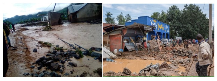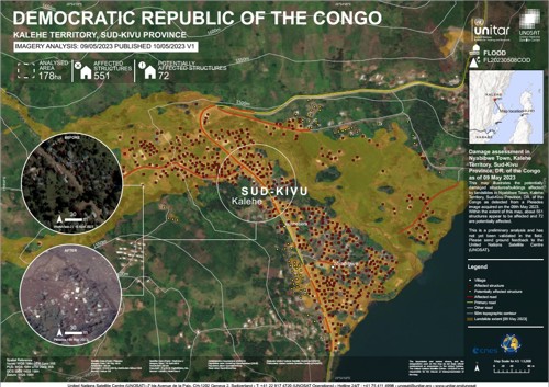 本次洪災主要影響剛果民主共和國東南部南伍基省(South-Kivu Province)的卡萊赫地區(Kalehe Territory)之Luzira, Bushushu, Chabondo 和 Nyamukubi等村莊因連日降雨,造成Cishova和Kanyunyi河氾濫成災,引起鄰近之卡杜圖鄉(Kadutu commune of Bukavu)發生土石流。根據聯合國兒童基金會(The United Nations Children's Fund, UNICEF)截至5月9日報告指出,已造成422人罹難,超過5,000人失蹤,共影響約2萬人(含約1萬名兒童)、約3,000棟建築物受到影響,其中約1,200棟房屋損毀(含3所小學及1所中學),另Nyamukubi當地約70%的農田灌溉之基礎設施遭破壞,相關災情照片如圖5。根據聯合國衛星中心(UNOSAT)提供5月9日之Pléiades衛星影像判釋Nyamukubi村之崩塌影響區域,影像分析結果顯示,約有551棟建築物受到破壞,約有72棟建築物有潛在受到影響的可能,如圖6。
