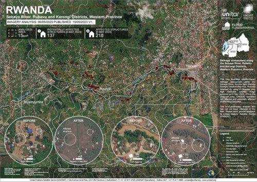 連日強降雨發生於盧安達的北部及西部省之Rubavu、Ngororero、Nyabihu、Rutsiro、Karongi、Gakenke、Burera、Musanze 和 Nyamagabe等村莊造成嚴重災情。截至盧安達政府5月3日統計資料,已造成127人死亡,相關災情說明如圖2,當地災情照片如圖3。此外根據聯合國衛星中心(United Nations Satellite Center, UNOSAT)提供5月6日之Pléiades衛星影像,可了解盧安達受洪災衝擊的範圍,影像判釋成果顯示西部省的Rubavu 和 Karongi 村的 Sebaya 河沿岸因洪災氾濫而影響,約218棟建築受到影響,如圖4。