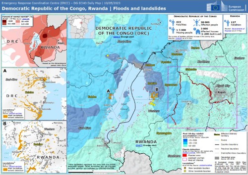 盧安達和剛果民主共和國交界地區在5月3日至5日遭受了嚴重降雨,導致洪災和崩塌。盧安達北部和西部省以及剛果民主共和國南伍基省是受災最嚴重的地區,降雨量累計約150毫米。根據歐盟緊急應變協調中心(ERCC)統計,災害已造成盧安達127人和剛果民主共和國約422人死亡。剛果民主共和國政府更是宣布5月8日為全國哀悼日。救援機構和國際組織正全力救援,提供食物、水源、藥品和臨時住所,同時強調應加強早期預警系統,提前警示危險並引導人們疏散到安全地區。