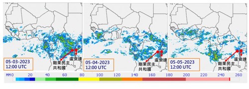 圖1、盧安達及剛果民主共和國5月3日至5日之24小時降雨資料(資料來源:NOAA)
