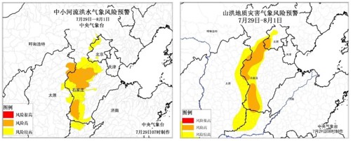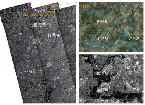 由於強降雨影響時間長及範圍廣,累積降雨量100毫米以上之降雨面積可達約22萬平方公里,影響1.3億人口,因此中國氣象局針對北京南部、河北中西部、河南北部等地區,發布有超過警戒之洪水與坡地災害風險預警(圖5)[9]。極端強降雨導致多處嚴重災情,包括:北京永定河洪水氾濫(圖6)[10]、故宮紫禁城淹水、門頭溝市區被洪水淹沒、房山區潰溢堤等。圖7顯示為北京市房山區大石河流域於7月31日之衛星影像,可看出洪水面積明顯增加[11]。