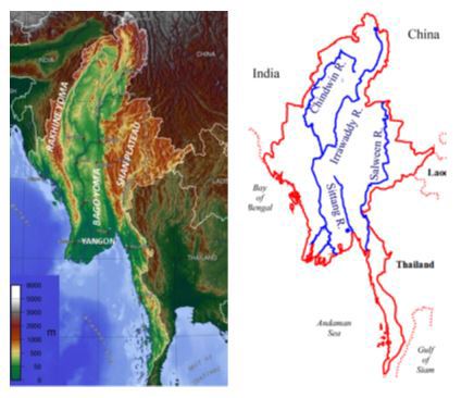 緬甸的地形與水系分布如圖2所示,西部若開山脈(Rakhine Yoma),北部喜馬拉雅山脈,東部撣邦高原(Shan Plateau)。境內伊洛瓦底江(Irrawaddy R.)長約2,288公里,是緬甸最長河系,流域面積為420,934平方公里[3][4]。