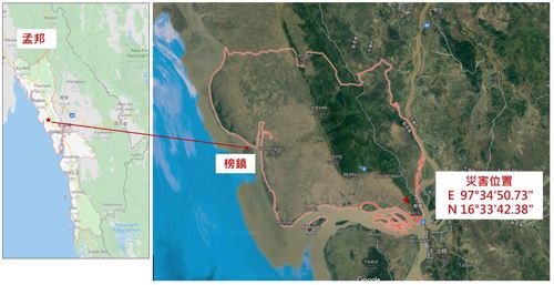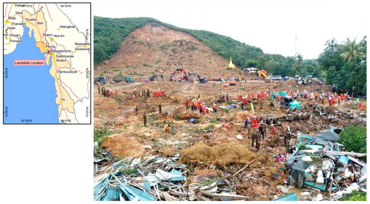 今(2019)年緬甸季風洪水災害,約從6月下旬開始,7月中旬克欽邦(Kachin State)、若開邦(Rakhine State)和實皆省(Sagaing Region)等地,都遭受了較大的季風雨衝擊,約4萬多人流離失所,而在8月6日左右又發生一波強降雨,引發了更多的洪水災害,伊洛瓦底省(Ayeyarwady Region)、克倫邦(Kayin State)、孟邦及勃固省都接連遭受影響。據聯合國人道主義事務協調辦公室(UN Office for the Coordination of Humanitarian Affairs )調查,在8月7日到8月9月間,克倫邦和勃固省各有3,300及3,700人流離失所。其中,人員死傷最嚴重的事件,是8月9日當地時間早上8點,發生在孟邦榜鎮Thaphyu Koneh村的崩塌災害。榜鎮是位在孟邦中部直通縣(Thaton District)內的鄉鎮(圖4),面積約974.37平方公里,人口21萬人[8],崩塌災害發照片如圖5所示。
