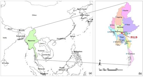 圖1-緬甸地圖(a)位置圖、(b)國家行政區分布圖