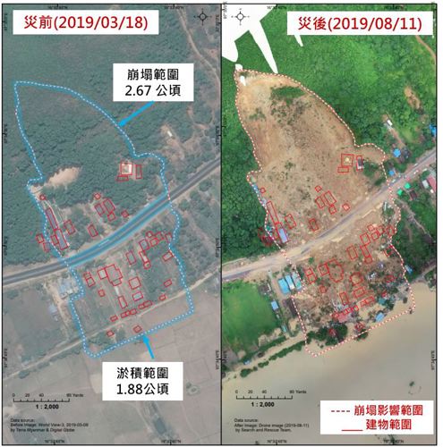 Thaphyu Koneh村的崩塌土石不止沖毀當地建物,還衝擊了載有乘客的車輛,根據官方紀錄截至8月14日已造成72人死亡,建物損毀約30棟,當地建物受損圈繪如圖6所示,紅色虛線為本次崩塌影響範圍,邊坡崩塌範圍約2.67公頃,紅色實線為受損建築物。官方認為造成災害發生的原因是當地連續兩天降雨,累積雨量達766毫米,使得Ma Latt山丘水分飽和,最後導致崩塌發生[9]。在孟邦的其他地方,降雨也造成阿塔揚河( Attayan River)水位高漲,淹沒Kyaikmayaw低窪地區,迫使該地有4726戶家庭、25,000多人撤離家園。根據緬甸氣象水文部門紀錄,孟邦毛淡棉(Mawlamyine)氣象站在8月9日的24小時累積雨量為356毫米,而Kyaikkhami 的24小時的累積雨量是286毫米 [11] 。