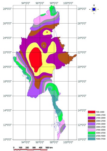 緬甸氣候約可分為:11月到2月是冬季,3月與4月是夏季,5月到10月是雨季,主要受西南季風影響。年平均降雨量最高的是緬甸南部雨若開邦沿海地區,降雨在2,500~5,500毫米間[5],緬甸年平均降雨量分布如圖3所示。季風降雨通常是從六月起,往南向北方延伸,逐漸遍佈在全國各地,根據官方紀錄6月到8月的月平均雨量都有400毫米以上,9月晚期季風是300毫米以上 [6]。