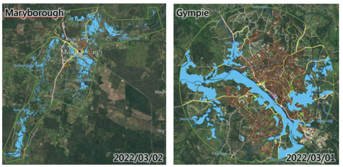 圖7、Mary River鄰近城市Maryborough與Gympie衛星影像淹水範圍圖(資料來源:Copernicus)