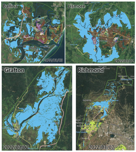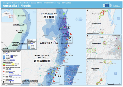 根據歐盟緊急應變協調中心(Emergency Response Coordination Centre, ERCC)於2022年3月3日發佈澳洲東岸的洪水範圍地圖(圖5),顯示洪水主要影響區域為昆士蘭州與新南威爾斯州,造成當地多條River川水位暴漲超過警戒值,引發嚴重洪災,以下詳述重災區之淹水災情狀況,昆士蘭州(A)區:位於Marybought、Gympie;昆士蘭州(B)區:Wivenhoe、Brisban、Gatton、Grantham;新南威爾斯州(C)區:Ballina、Lismore、Grafton、Richmond;以及雪梨周邊地區(D)區:雪梨周邊地區:Ballina、Lismore、Grafton、Richmond等地區。