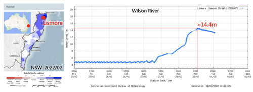 新南威爾斯州(NSW)地區同樣受強降雨影響造成當地多條河流水位在短時間內快速升高。包括:Wilson River、Nepean River、Hawskbury River、Colo River、Georges River等。其中,Wilson River因這次強降雨造成水位暴漲,在2月28日達到創紀錄水位14.4公尺,超過1954 年(12.27公尺)的歷史高點,造成鄰近城市大範圍的淹水情況(圖13)。此外,該河水位在3月30日再次上漲達11.40公尺(圖14),高於沿岸鄰近的Lismore城市的10.65公尺高的河堤高度,造成該鎮一個月歷經兩次洪災,因此,新南威爾斯州緊急應變中心向Lismore緊急發布疏散令。該鎮上一次大洪水發生於 2017年,水位達到11.59 公尺,僅僅五年後便再度發生這次嚴重的洪水事件,許多當地人對於頻繁發生大洪水感到震驚。