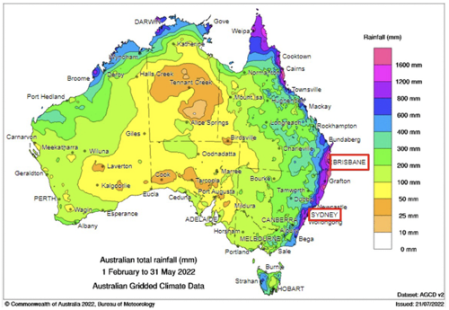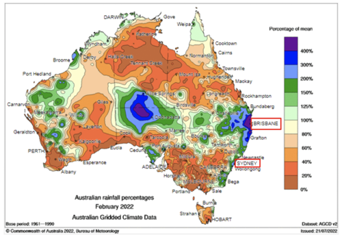 主要影響澳洲東岸的昆士蘭州東南部和新南威爾斯州北部沿海地區,並造成大範圍的淹水。根據澳洲氣象局的資料顯示,本次豪雨事件始於2月22日至2月28日因滯留的低壓系統在昆士蘭東南部(布里斯本地區)及新南威爾斯北部降下大雨,2月28日新南威爾斯的Rosebank測站日雨量甚至達到701.8毫米;低壓系統於3月初往南移到新南威爾斯中部地區,並形成了東海岸低壓(East coast lows),因此強風暴雨也跟著往南移動到南邊沿海的雪梨地區,此區域的降雨至3月9日才開始趨緩(圖2B);3月底暴風雨再度襲擊昆士蘭東南部黃金海岸(Gold coast)地區,在3月28日部分地區24小時累積降雨量達300毫米(圖2C);而4月7日開始新南威爾斯北部及中部沿海地區又再次降下大雨,部分區域24小時累積雨量達200毫米(圖2D)。此次降雨事件在2月昆士蘭的陽光海岸(Sunshine Coast)和昆士蘭東南沿海地區及3月的新南威爾斯州北部和中部沿岸地區創下歷史新高;2月昆士蘭東南部和新南威爾斯州東北部部分地區降雨為月平均降雨的2.5倍,昆士蘭部分地區的降雨量甚至超過2月份月平均降雨量的5倍(圖2),另外在2月22日至2月28日超過30個測站在6天內即降下1,000毫米的雨量,在2月至3月份這些區域的年平均降雨量約1,000-1,200毫米,等於是在幾天內下了一年的雨量。根據澳洲氣象局歷史資料顯示,今年(2022)前三個月降下幾場豪雨,累積降雨量已達1,223.8毫米,高於雪梨年平均降雨量的1,213毫米。