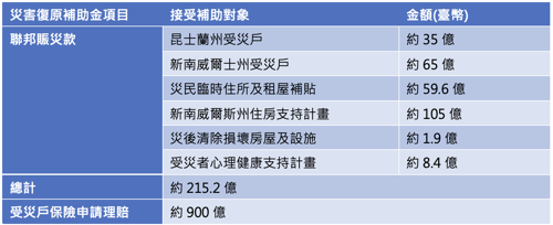 表1、2022年澳州洪災聯邦政府提供主要受災戶補助津貼列表。