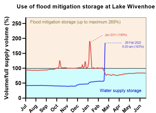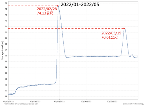 位於Brisbane Rivers上游的Wivenhoe水庫也因為這次的極端天氣帶來的豪雨,在2月28日時庫容水位上升達74.13公尺,蓄水率達182.9%,為歷史上第二高,並進行調節性洩洪,僅次於2011年1月11日的74.79公尺,當日蓄水量為220萬兆升,蓄水率達190%(圖9、11)。此外,5月15日再次經歷豪雨事件,庫容水位再次升高至70.61公尺(圖10),使Wivenhoe等大壩再次實施調節性洩洪作業,使Brisbane Rivers沿岸地區再度發生輕微洪水災害。
