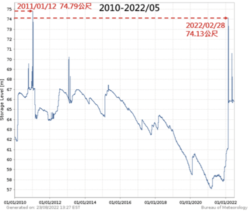 圖9、Wivenhoe大壩2010年至2022年歷史水位歷線圖(資料來源:澳洲氣象局)