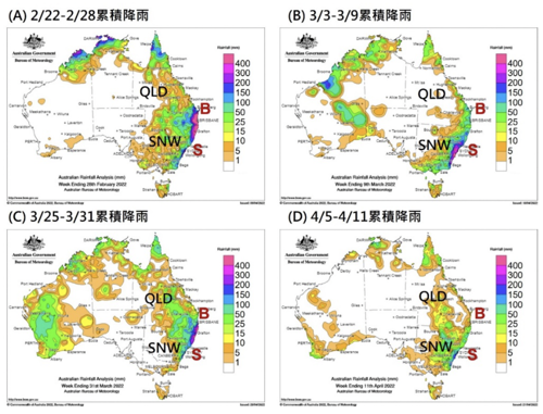 圖2、2月至4月極端降雨事件累積降雨圖,B (Brisbane)、S (Sydney),QLD昆士蘭、SNW新南威爾斯(圖片來源:澳洲氣象局)