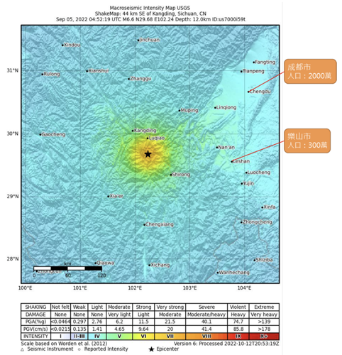 圖1、中國四川瀘定縣地震震度分布與鄰近城市 (USGS,[2])
