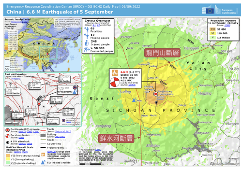 中國四川省於2022年9月5日12時52分,在四川盆地西緣的瀘定縣發生規模6.8地震、震源深度16.0 km的淺層地震,震央附近最大地表加速度超過0.2 g、最大地表速度超過10 cm/sec,地表震度為MMI 6.5(相當於臺灣震度5弱級)。根據美國地質調查所(USGS)公布之震源機制解,本次地震為走向滑移斷層錯動引致。截至9月8日12時止,四川當地共發生19起餘震,規模介於2.8至4.5。